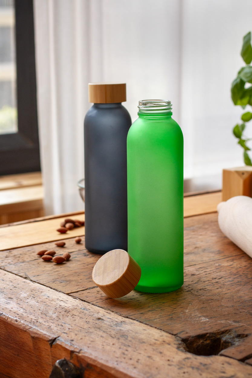 Trinkflasche aus gefrostetem Glas mit Bambusdeckel. Füllmenge: 500 ml. Nicht geeignet für kohlensäurehaltige Getränke.