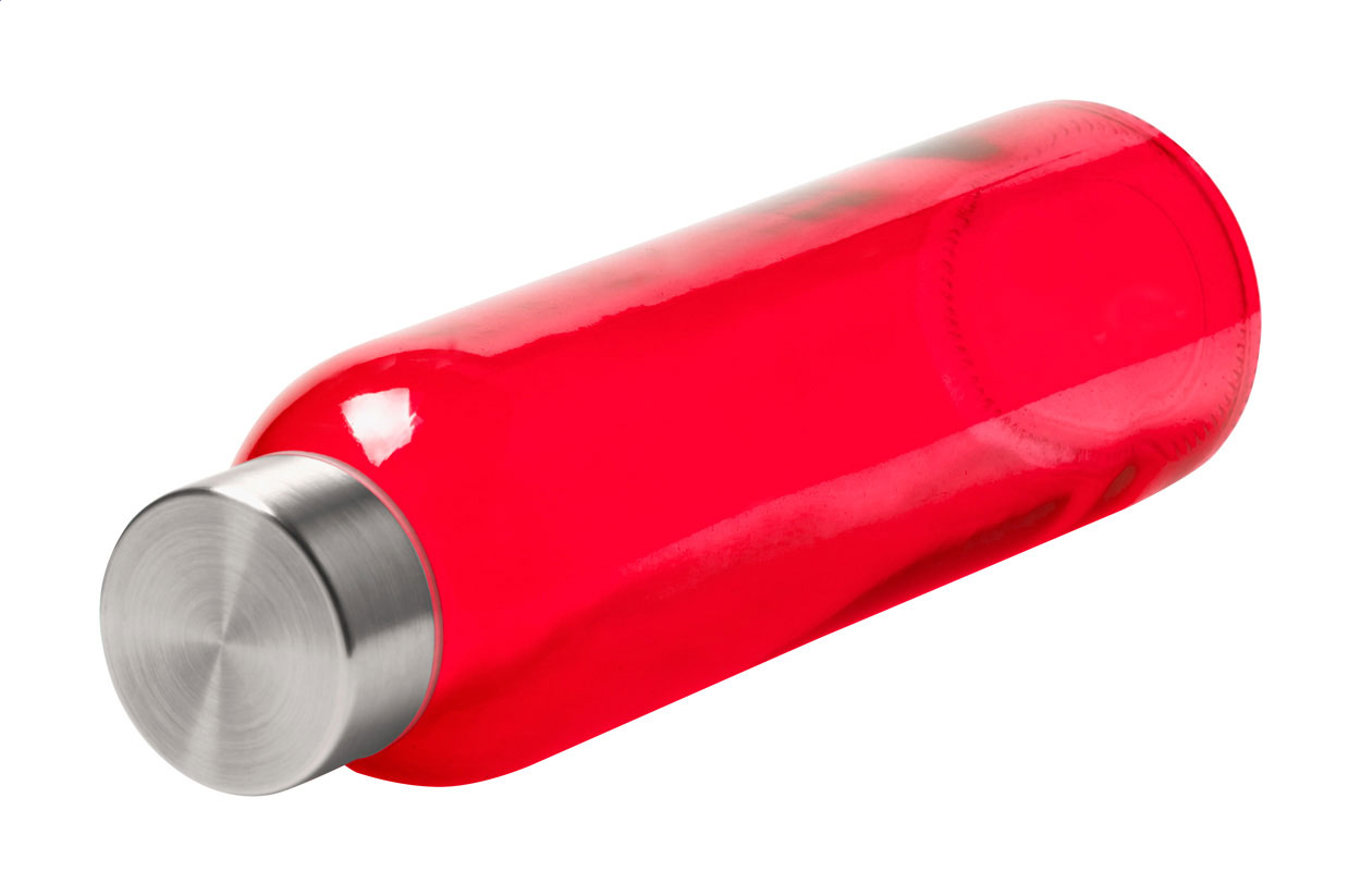 Transparente Glasflasche mit Edelstahlkappe, 500 ml. Im Geschenkkarton. Nicht geeignet für kohlensäurehaltige Getränke.
